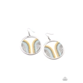 Infused with a glittery row of white rhinestones, shiny Cerulean and Illuminating arcs curve into juxtaposed frames inside a classic silver hoop, creating a colorful art deco inspired centerpiece. Earring attaches to a standard fishhook fitting.
