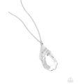 Capped in a white rhinestone encrusted fitting, glittery silver ribbons of white rhinestones delicately wrap around the top of a dramatically oversized white teardrop gem. The dazzling pendant swings from the bottom of a lengthened silver chain, creating a glamorous statement piece. Features an adjustable clasp closure.