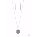 A floral embossed silver disc and dainty wooden and turquoise stone beads swing from the bottom of a lengthened silver chain for a whimsical look. Features an adjustable clasp closure.