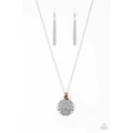 A floral embossed silver disc and dainty wooden and orange stone beads swing from the bottom of a lengthened silver chain for a whimsical look. Features an adjustable clasp closure.