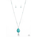 Dotted with dainty silver flowers and turquoise stone beads, a shimmery silver chain gives way to an oversized turquoise stone teardrop pendant for a whimsical look. A lobster clasp hangs from the bottom of the design to allow a name badge or other item to be attached. Features an adjustable clasp closure.