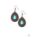 Chiseled into a tranquil teardrop, a refreshing turquoise stone is pressed into the center of an ornate copper frame radiating with studded and antiqued filigree patterns for a seasonal look. Earring attaches to a standard fishhook fitting.