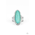 An oblong turquoise stone is pressed into the center of an ornate silver frame for a seasonal look. Features a stretchy band for a flexible fit.