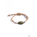 An oval green stone is pressed into a textured silver frame between two silver beads that glide along brown suede bands around the wrist, creating an earthy centerpiece. Features an adjustable sliding knot closure.
