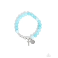 Threaded along stretchy bands, vibrant blue stone beads join smooth silver discs around the wrist. A dainty silver cross and silver disc dangle from the design, adding a meaningful touch to the design.