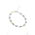 Infused with dainty silver accents, a collection of blue, yellow, and pink reflective beads are threaded along an invisible band around the ankle for a seasonal finish.