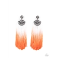 Gradually fading from white to orange, shiny cording streams from the bottom of hammered silver frames, creating a colorful fringe. Earring attaches to a standard post fitting.