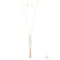 Shiny rose gold hoops and white rhinestone encrusted hoops connect at the bottom of a lengthened shiny rose gold chain, creating a glittery stacked pendant. A rose gold tassel swings from the bottom for a flirty finish. Features an adjustable clasp closure.