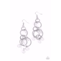 Opaque white teardrops sporadically cascade from an assortment of mismatched silver links, resulting in a whimsically tasseled chandelier. Earring attaches to a standard fishhook fitting.