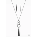 Delicately hammered in glistening textures, shimmery gunmetal hoops swing from the bottom of a shiny gunmetal chain, creating a bold industrial pendant. A shimmery gunmetal tassel swings from the bottom of the stacked pendant for a seasonal finish. Features an adjustable clasp closure.