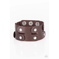 Pieces of shiny brown leather are studded together to create an edgy urban look around the wrist. Features an adjustable snap closure.