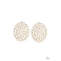 Brilliant white rhinestones encased in classic shiny gold fittings are connected into an oval frame and coalesce into a lacework of shimmer. Earring attaches to a standard post fitting.