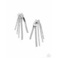 Set in silver square fittings, a trio of white rhinestone strands cascades in tapered lengths from the ear, coalescing with two silver herringbone chain strands, swaying in the opposite direction for an iconic, industrial cascade. Earring attaches to a standard post fitting.