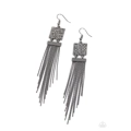 A tapered curtain of flat gunmetal chains cascades from a gunmetal rectangular fitting that delicately links to a gunmetal square frame dotted in dainty hematite rhinestones, resulting in a trendy tassel. Earring attaches to a standard fishhook fitting.