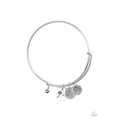 Stamped in dandelion patterns, glistening silver charms featuring floral patterns slide along a sleek bar fitting for a whimsical look. Features a toggle closure.