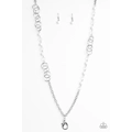 Glassy and polished white beads give way to sections of shimmery silver hoops along a glistening silver chain for a seasonal look. A lobster clasp hangs from the bottom of the design to allow a name badge or other item to be attached. Features an adjustable clasp closure.
