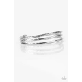 Etched in shimmery geometric patterns, glistening silver bars arc across the wrist, coalescing into a dainty cuff.