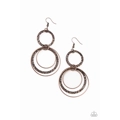 A mismatched collection of dainty copper rings and a hammered copper hoop dangles from the bottom of a hammered fitting, creating a dizzying lure. Earring attaches to a standard fishhook fitting.