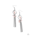 A glassy, faceted, teardrop-shaped bead in a subtle pink shade swings from the top of a silver, diamond-shaped frame. A cascade of silver chains falls from the bottom point of the frame, accompanied by a cluster of opaque beading in a muted pink tone and another smaller glass bead that matches the one swinging above. Earring attaches to a standard fishhook fitting.
