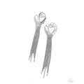 Pressed in silver-pronged fittings, a trio of white emerald-cut gems delicately perch at the base of an upside-down silver teardrop frame. Dainty silver chains taper along the edges of the teardrop frame for a glitzy, refined lure. Earring attaches to a standard post fitting.