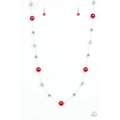 Infused with pearly red accents, classic silver and delicately hammered silver beads trickle along an elegantly elongated silver chain for a refined look. Features an adjustable clasp closure.
