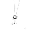 Featured along the ends of an elongated, twisted silver rope chain, a pointed silver arrow with a trio of textured fletchings can be threaded through a Roman Numeral-embellished, black-painted silver ring for a layered, luminescent look.