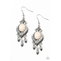 A smooth white stone is pressed into a silver frame radiating with floral details. Dainty silver beads swing from the bottom of the frame, adding a wanderlust finish to the seasonal palette. Earring attaches to a standard fishhook fitting.