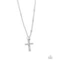 Dusted in dainty white rhinestones, a glistening silver cross pendant glides below the neckline from an abstract silver chain for a dazzling, divine display. Features an adjustable clasp closure.