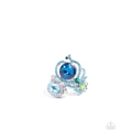 Featuring a dazzling display of elegance, a trio of faceted blue and green gems encased in silver fittings coalesce atop the finger. A large round blue gem takes center stage, encircled by glittering aquamarine rhinestones, while a smaller teardrop-shaped light blue gem and vibrant green accents add extra dimension and sparkle. Swirling silver filigree completes the bold and colorful design. Features a stretchy band for a flexible fit.