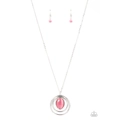 An oval pink cat's eye stone attaches to the top of silver rings that ripple out into a dizzying pendant at the bottom of an extended silver chain, resulting in a mystical pop of color. Features an adjustable clasp closure.