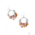 Blooming amongst textured silver leaves, a collection of Desert Rose, light peach, Buckthorn Brown, Winter Sky, and light pink rose acrylics coalesce below the ear from a silver hoop for a floral flair. Earring attaches to a standard fishhook fitting.