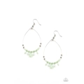 A dainty collection of silver, pearly, green, and iridescent crystal-like beads are threaded along a dainty wire teardrop frame. Matching crystal-like beads dangle from the bottom, creating an ethereal fringe. Earring attaches to a standard fishhook fitting.