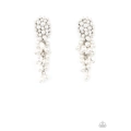 Featuring imperfect finishes, a bubbly tassel of white pearls trickles from the bottom of a pearl encrusted silver fitting for a timeless look. Earring attaches to a standard post fitting.