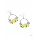Encrusted along the bottom of a silver hoop, a vivacious collection of painted yellow flowers with white rhinestone centers bloom next to silver and green marquise-cut gem leaves. White pearls, iridescent rhinestones, and fuchsia iridescent rhinestones coalesce across the surface of the hoop for additional light-catching attention. Earring attaches to a standard fishhook fitting. Due to its prismatic palette, color may vary.