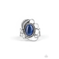 A glowing blue cat's eye stone is pressed into the center of a shimmery silver frame radiating with a silver feather and glistening white petals, creating a whimsical compilation atop the finger. Features a stretchy band for a flexible fit.