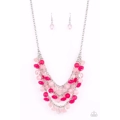 Varying in shape and opacity, a mismatched collection of light and dark pink crystal-like beads drip from the shimmery silver chains, creating an enchanted layered fringe below the collar. Features an adjustable clasp closure.
