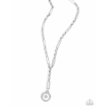 Doubled collections of silver rings connect to elongated silver paperclip chain links as they extend below the collar in a y-shaped arrangement. Featuring a white rhinestone center, a three-dimensional dainty silver star rests atop a white shell pressed in a silver frame that effortlessly spins inside a larger silver circle frame, threaded along a dainty silver rod, extending from the center of the design for a cosmically coastal finish. Features an adjustable clasp closure.