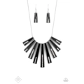 Elongated flared frames are painted in a glossy black finish and bordered by studded texture as they fan out along the collar. A row of rhinestones runs up the center of each frame, adding spectacular sparkle to the display as the pieces sway from a round silver chain. Features an adjustable clasp closure.