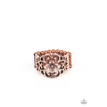 Glistening copper filigree blooms from a shimmery floral center, creating a whimsical band across the finger. Features a wide stretchy band for a flexible fit.