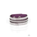 Rows of flat silver discs, glassy white rhinestones, and shimmery gunmetal chains are encrusted along purple suede bands for a sassy look. Features an adjustable snap closure.
