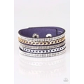 Glassy white and smoky rhinestones are encrusted along strands of blue suede. Glistening silver and gold chains are added to the bands, adding edgy industrial shimmer to the sassy palette. Features an adjustable snap closure.