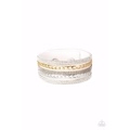 Glassy white and smoky rhinestones are encrusted along strands of white suede. Glistening silver and gold chains are added to the bands, adding edgy industrial shimmer to the sassy palette. Features an adjustable snap closure.