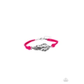 Strands of vivacious pink suede knot around a shimmery silver feather charm, creating a seasonal pendant atop the wrist. Features an adjustable sliding knot closure.