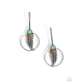 Pressed in a studded silver frame, a turquoise stone gives way to a textured silver feather, suspended along the center of a glistening silver hoop from an elongated silver fitting for a free-spirited lure. Rows of brown twine are wrapped along the base of the feather, meeting the turquoise stone for additional rustic detail. Earring attaches to a standard post fitting. As the stone elements in this piece are natural, some color variation is normal.