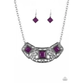 Glistening silver filigree spins into a dramatic pendant below the collar. Square plum beads are pressed into the airy frame for a colorful finish. Features an adjustable clasp closure.