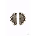 Tipped with triangular accents, flat brass studs fan out from the edge of a half moon frame embossed in antiqued linear texture, creating a bold tribal inspired display. Earring attaches to a standard post fitting.