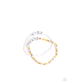 Threaded along stretchy bands around the wrist, a strand of white seed beads combines with a multicolored strand of seed beads to create a stunning pop of color. White cube beads are infused on each strand, spelling out the phrase "find peace" between them, creating inspirational layers.