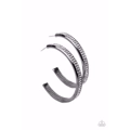 Two rows of glitzy white rhinestones are encrusted along the outside curve of a gritty gunmetal hoop, creating an understated rocker look. Earring attaches to a standard post fitting. Hoop measures approximately 1.5" in diameter.
