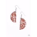 A faux Adobe stone semicircle disc, flecked with white accents, is outlined with a dainty silver half moon frame swaying in front for a flashy fad-inspired fashion. Earring attaches to a standard fishhook fitting.