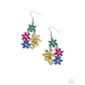 Glittery hot pink, emerald, yellow, and royal blue marquise-cut flowers with white rhinestone centers in varying sizes, silver links, and solitaire white rhinestones coalesce into an unspoken teardrop shape for a glamorous, whimsical fashion. Earring attaches to a standard fishhook fitting.